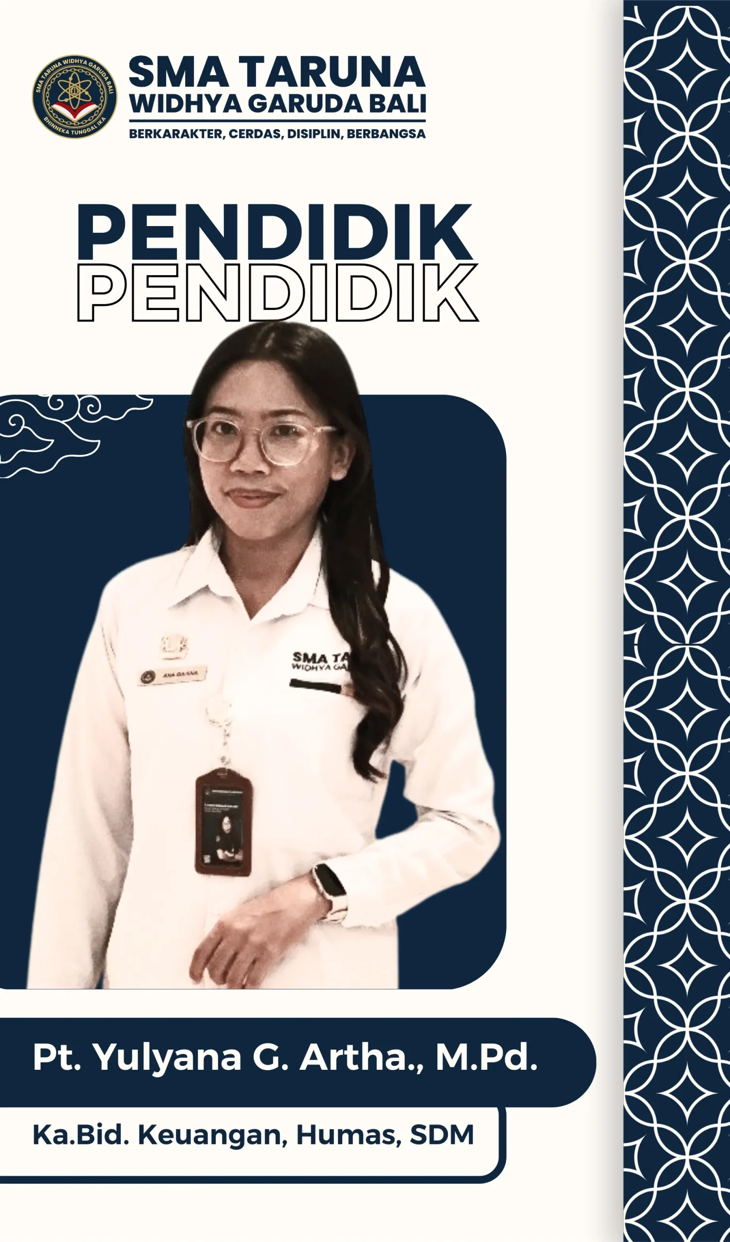 Pt. Yulyana Grisnawati Artha Position: Head of HRStatus: GTYNIP: -NUPTK: -Active: 2021 - SekarangGender: PerempuanPlace & Date of Birth: -Religion: HinduAddress: Denpasar Kepala Bidang SDM Facebook Twitter WhatsApp Pinterest