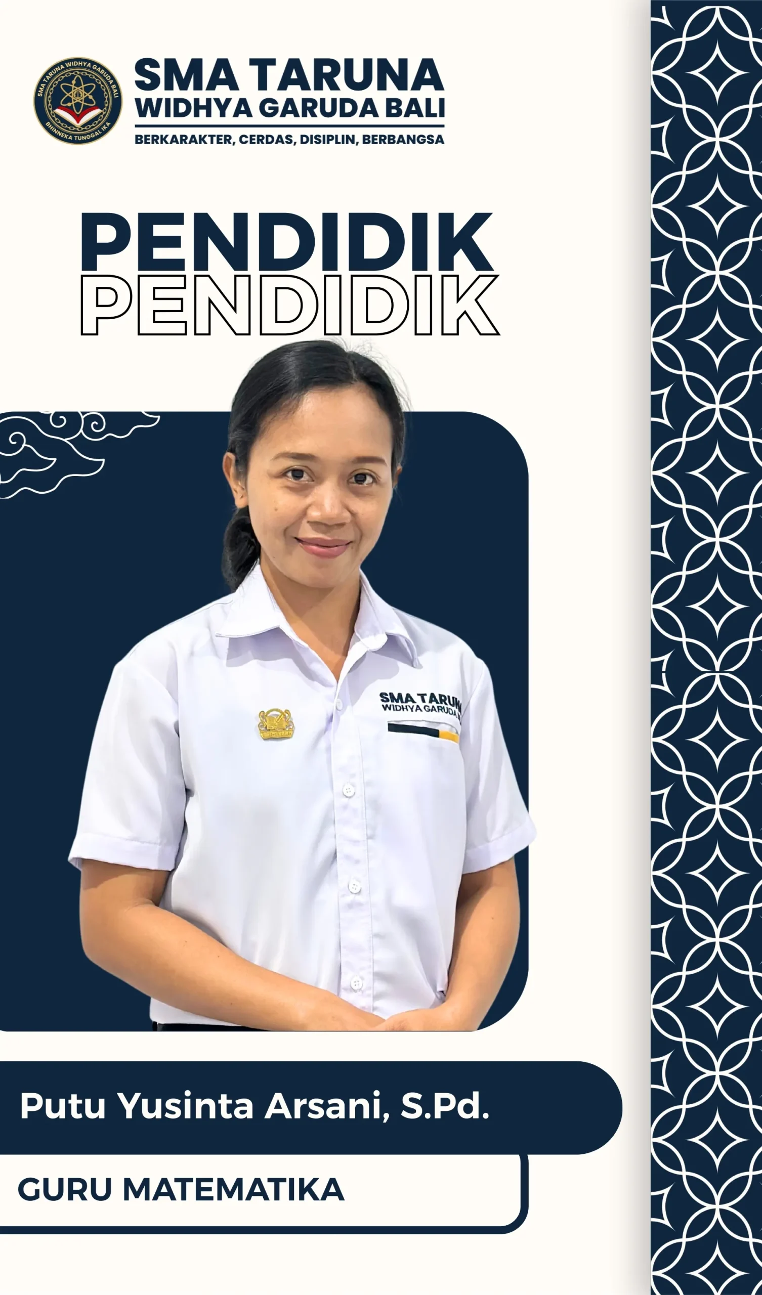Putu Yusinta Arsani Position: Math TeacherStatus: GTYNIP: -NUPTK: -Active: 2023 - SekarangGender: PerempuanPlace & Date of Birth: -Religion: HinduAddress: Badung Tenaga Pendidik Mapel Matematika Facebook Twitter WhatsApp Pinterest