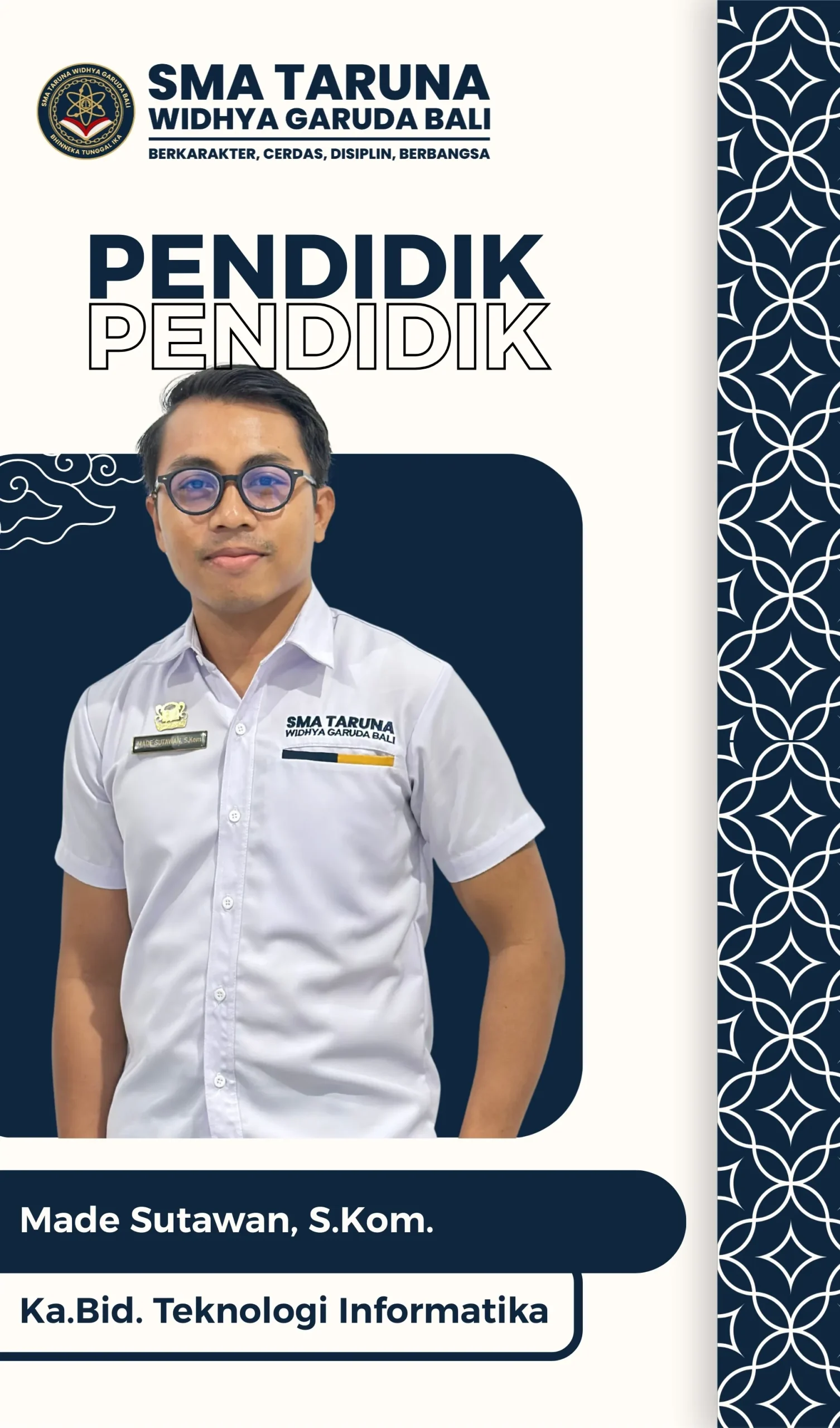Made Sutawan Jabatan: Kabid ITStatus: GTYNIP: -NUPTK: 5045771672130113Aktif: 2021 - SekarangKelamin: Laki - LakiTempat & Tanggal Lahir: Madenan, 13 Juli 1993Agama: HinduAlamat: Denpasar Kabid IT & Tenaga Pendidik Mata Pelajaran Informatika Facebook Twitter WhatsApp Pinterest